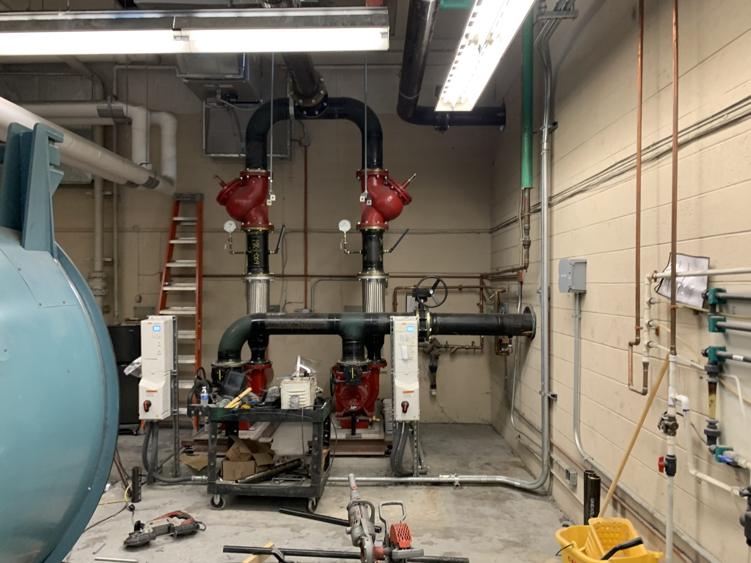 Under this project, sixteen (16) air handlings units that were original to the building were replaced. The majority of the units were located in the mechanical penthouses while a few were relocated to the roof to allow for adequate clearances. Calculations were performed to ensure code compliant outdoor air flow rates were being met. In addition, all existing VAV terminals were replaced and new heating water piping was extended to each VAV terminal since the existing units did not include reheat coils. The existing VAV zones were evaluated and modified to ensure each classroom had individual room control. Additionally heating water pumps, chilled water pumps, condenser water pumps and all associated piping throughout the entire building were replaced.