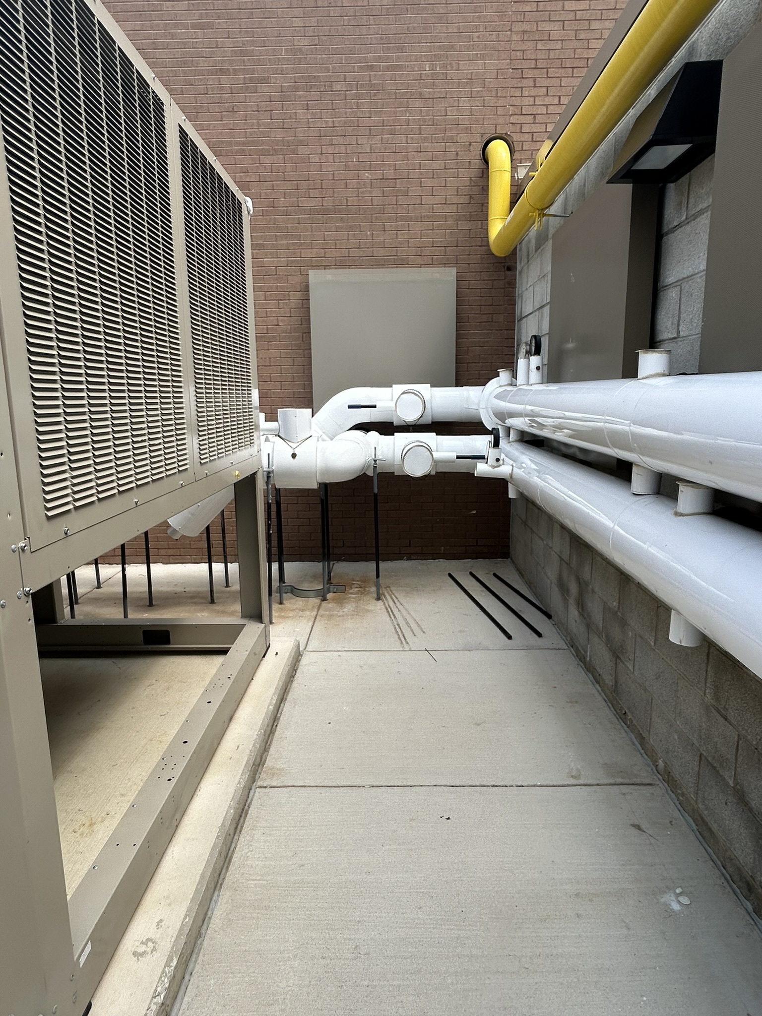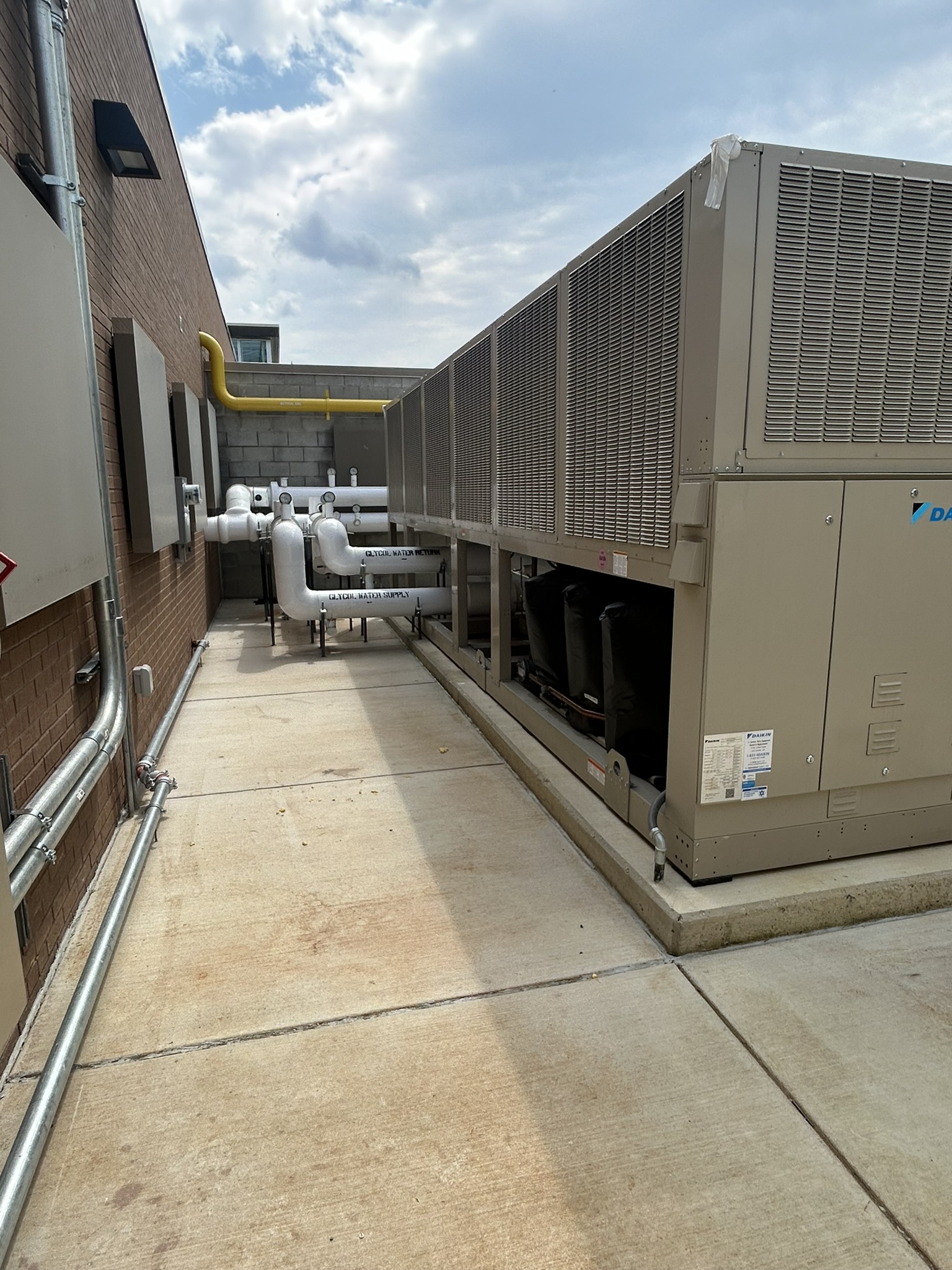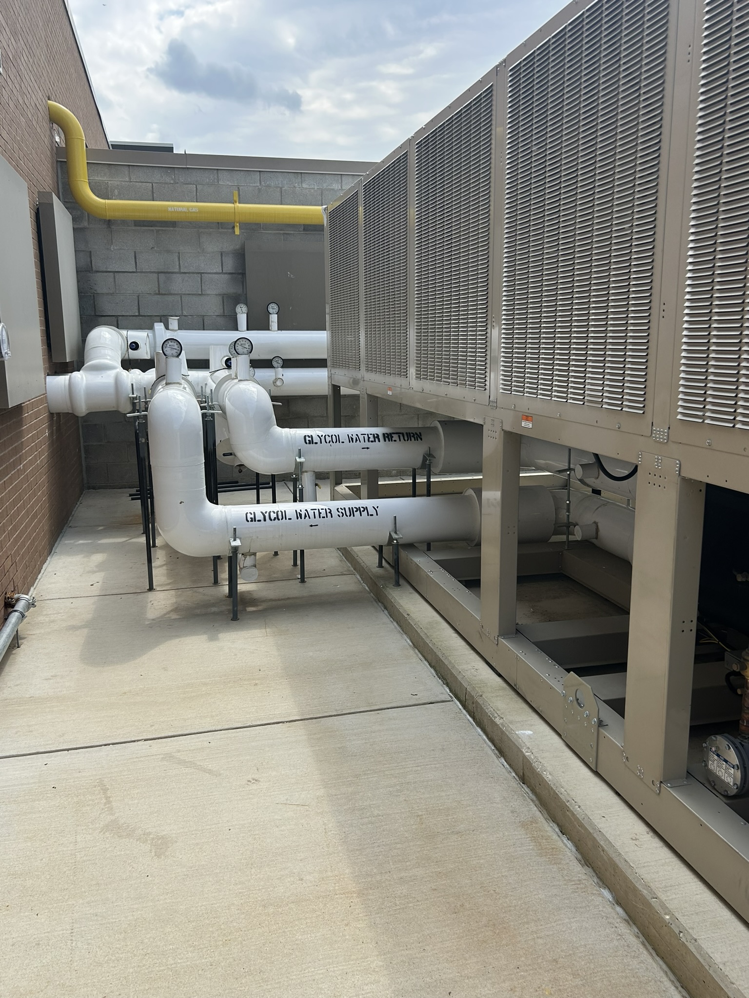 The mechanical system designed for this school includes a chiller and boilers as the main cooling and heating sources for the building. Chilled and heating water are circulated throughout the building to serve fan coil units (FCUs) in each classroom. The FCUs are ducted, above ceiling, re-circulating units which provide heating and cooling to each occupied space. Ventilation air is provided through rooftop DOAS (dedicated outside air system) units with energy recovery wheels. The administration area and media center are served by air cooled heat recovery VRF systems so that they can operate independent from the central chiller. These spaces also have a DOAS unit for ventilation purposes. The gymnasium, cafeteria and before/after care area are each equipped with a single zone air handling unit with a chilled water coil (for normal operation) and a DX coil (for summer operation when the chiller is de-energized).